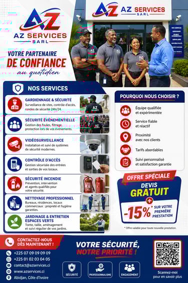 AZ Services vous propose un service de gardiennage haut de gamme, pensé pour garantir votre sécurité au quotidien. Grâce à une équipe d’agents formés et expérimentés, l’entreprise assure une surveillance rigoureuse de vos biens, que ce soit pour des sites professionnels, des résidences ou des événements.